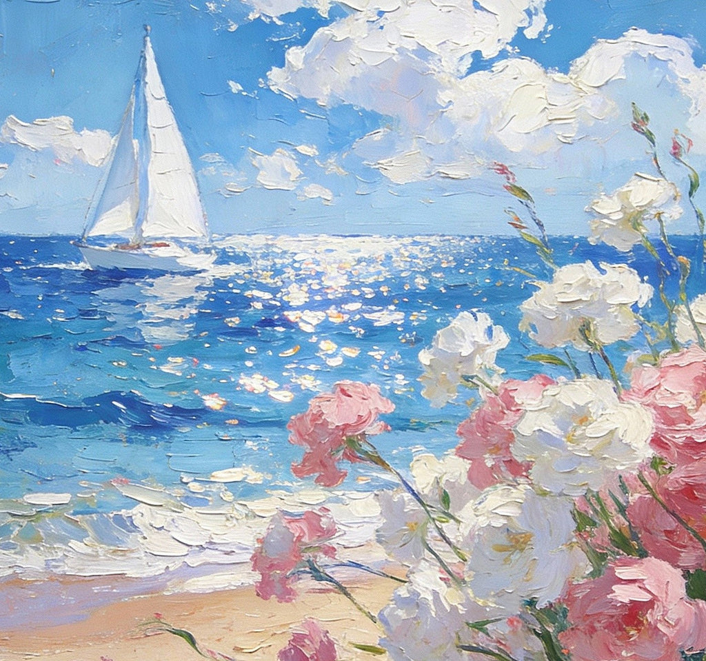 Blooms by the Shore, A Sailboat’s Journey, Simple Painting Ideas, Hand Painted Wall Art, Small Wall Paintings, Landscape Canvas Paintings, On Canvas Small Paintings