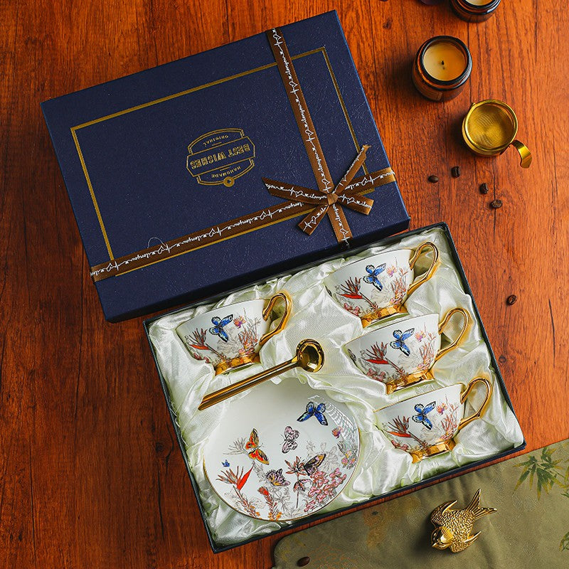 British Afternoon Tea Cup and Saucer Set, Ceramic Coffee Cups in Gift Box, Butterfly Pattern Porcelain Tea Cup and Saucer Set