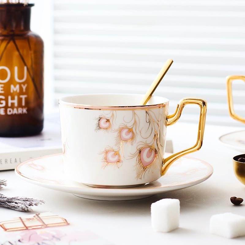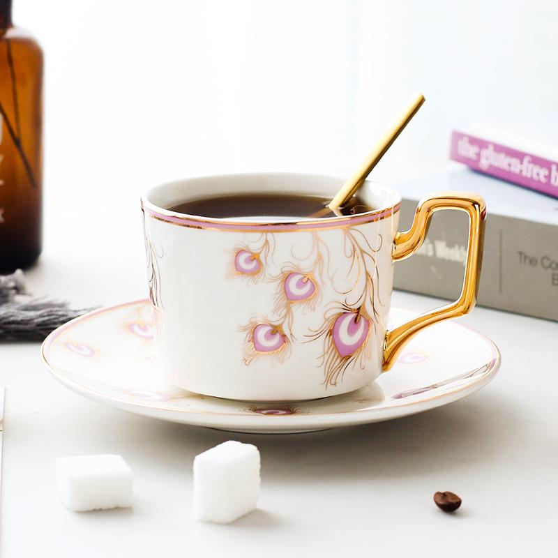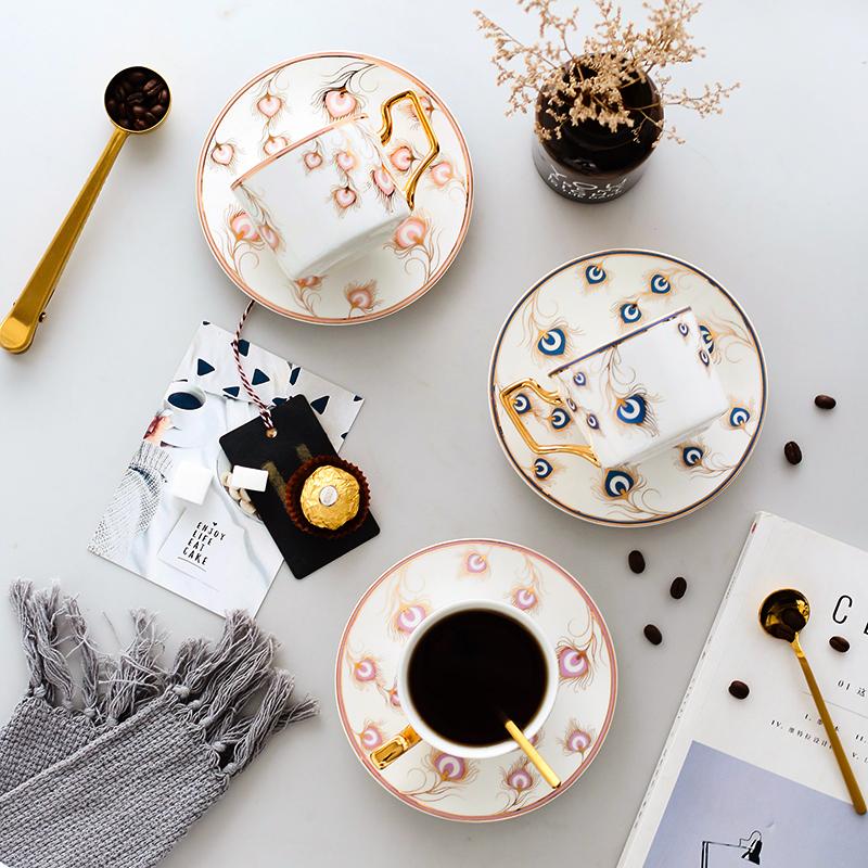 British Tea Cups, Coffee Cups with Gold Trim and Gift Box, Peacock Tail Pattern Porcelain Coffee Cups, Tea Cups and Saucers