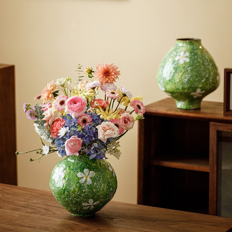 Modern Pottery Flower Vases, Centerpiece on Dining Table, Handmade Water Holding Flower Vases, Pottery Bud Vases, Large Green Flower Vases on Table