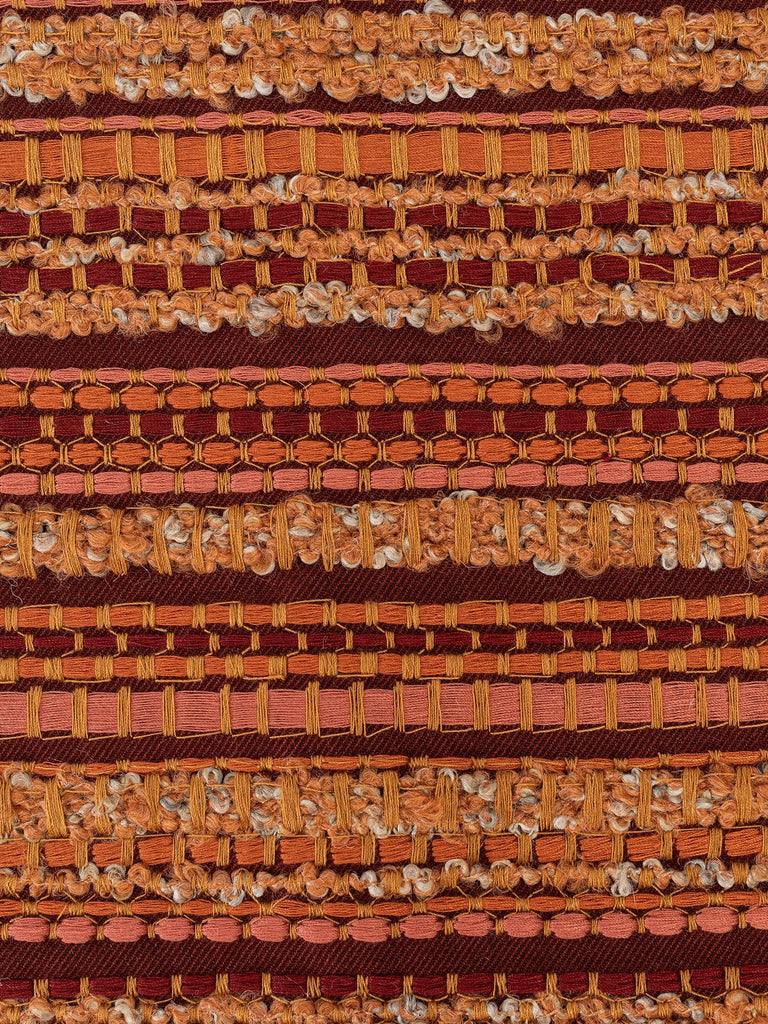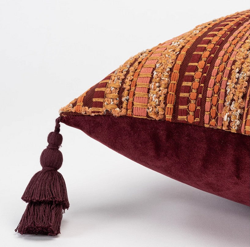 This cushion, a harmonious blend of warm earthy tones, weaves together rich maroon, amber, and terracotta hues in intricate striped patterns. Its soft, inviting texture invites you to sink into comfort, while its bold design transforms any space into a cozy, artistic haven.
