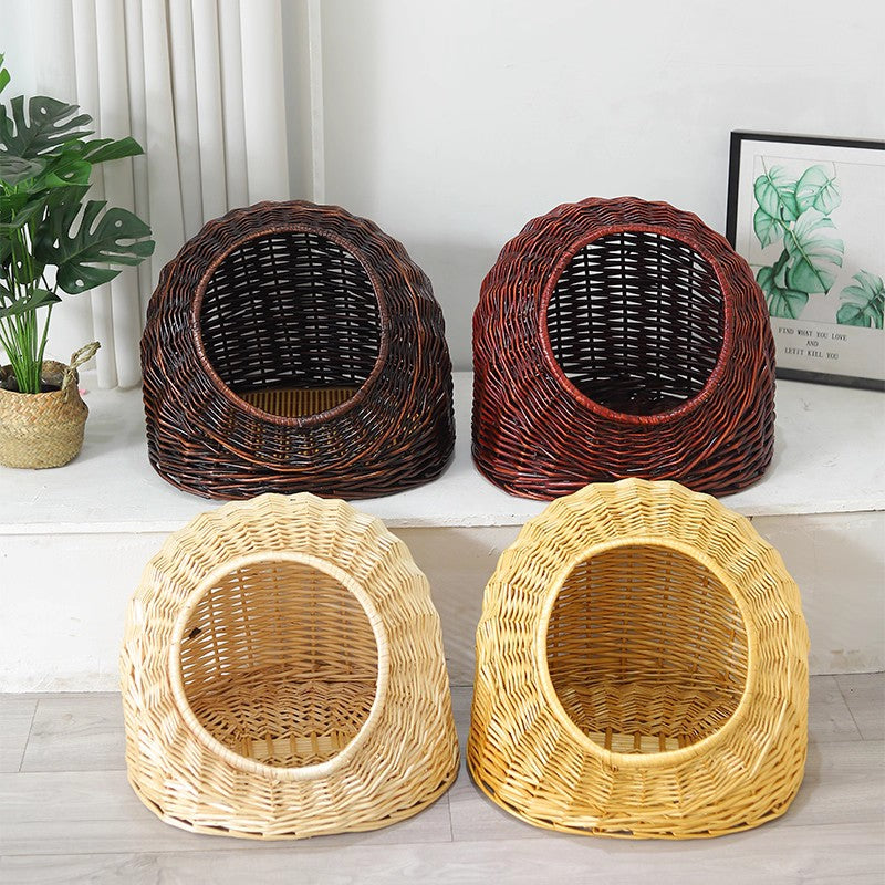 Wicker Cat House Basket with Washable Cushion for Indoor Cats and Dogs, Rattan Cat Bed