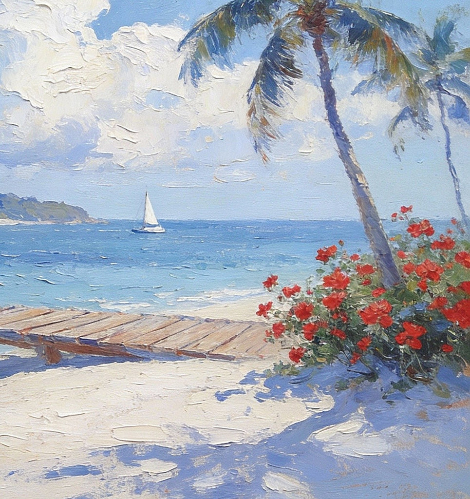 Simple Painting Ideas, Tropical Beach with Palm Trees and Dock, Small Wall Art on Canvas, Landscape Canvas Paintings, Impasto Wall Art Paintings, Original Oil Paintings