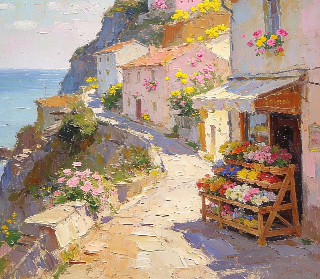 Sunlit Cliffside Town, Flowers, Houses, and Ocean Views, Original Artwork Small Paintings, Hand Painted Canvas Art, On Canvas Small Paintings, Palette Knife Artwork, Landscape Artwork, Canvas Paintings