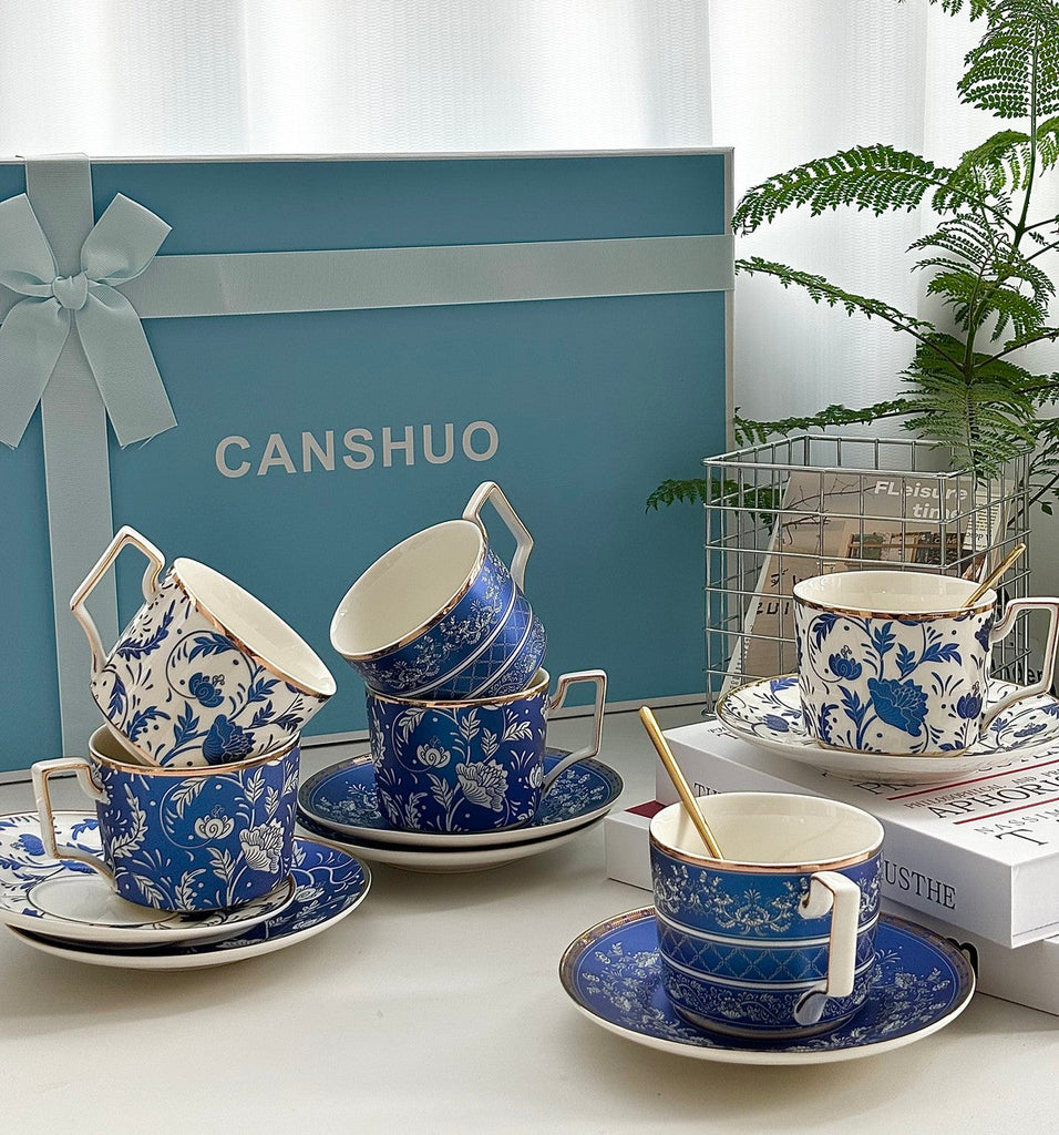 Unique British Afternoon Tea Cup Set with Teapot, Ceramic Coffee Cup with Saucer in Gift Box, Blue Porcelain Tea Cup and Saucer Set