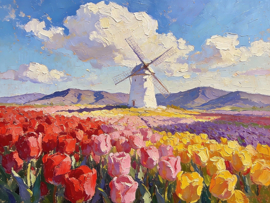 Windmills Amidst the Blooming Tulip Fields, Small Landscape Paintings, Small Oil Paintings on Canvas, Small Canvas Paintings, Original Oil Paintings, Hand Painted Canvas Art, Simple Painting Ideas-ArtWorkCrafts.com